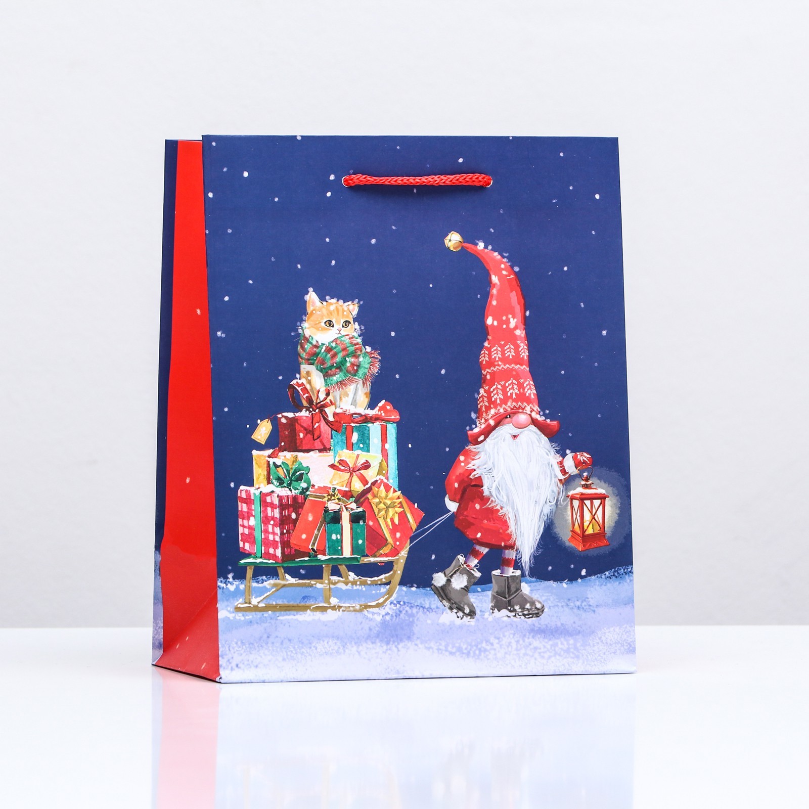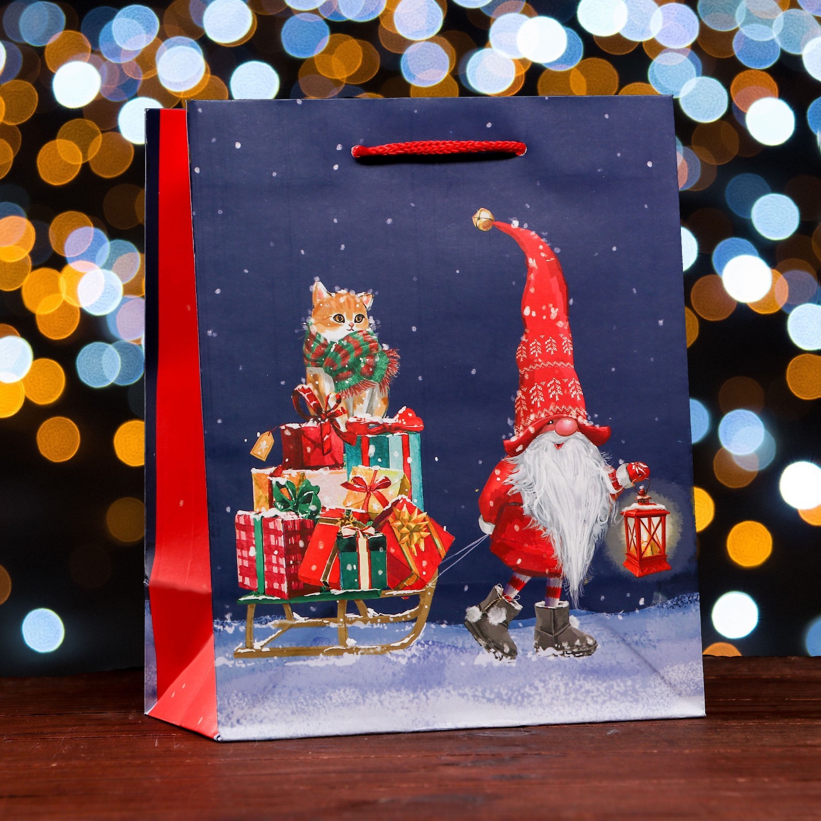 Новогодний подарочный пакет с ярким, красочным рисунком создаст праздничное настроение.