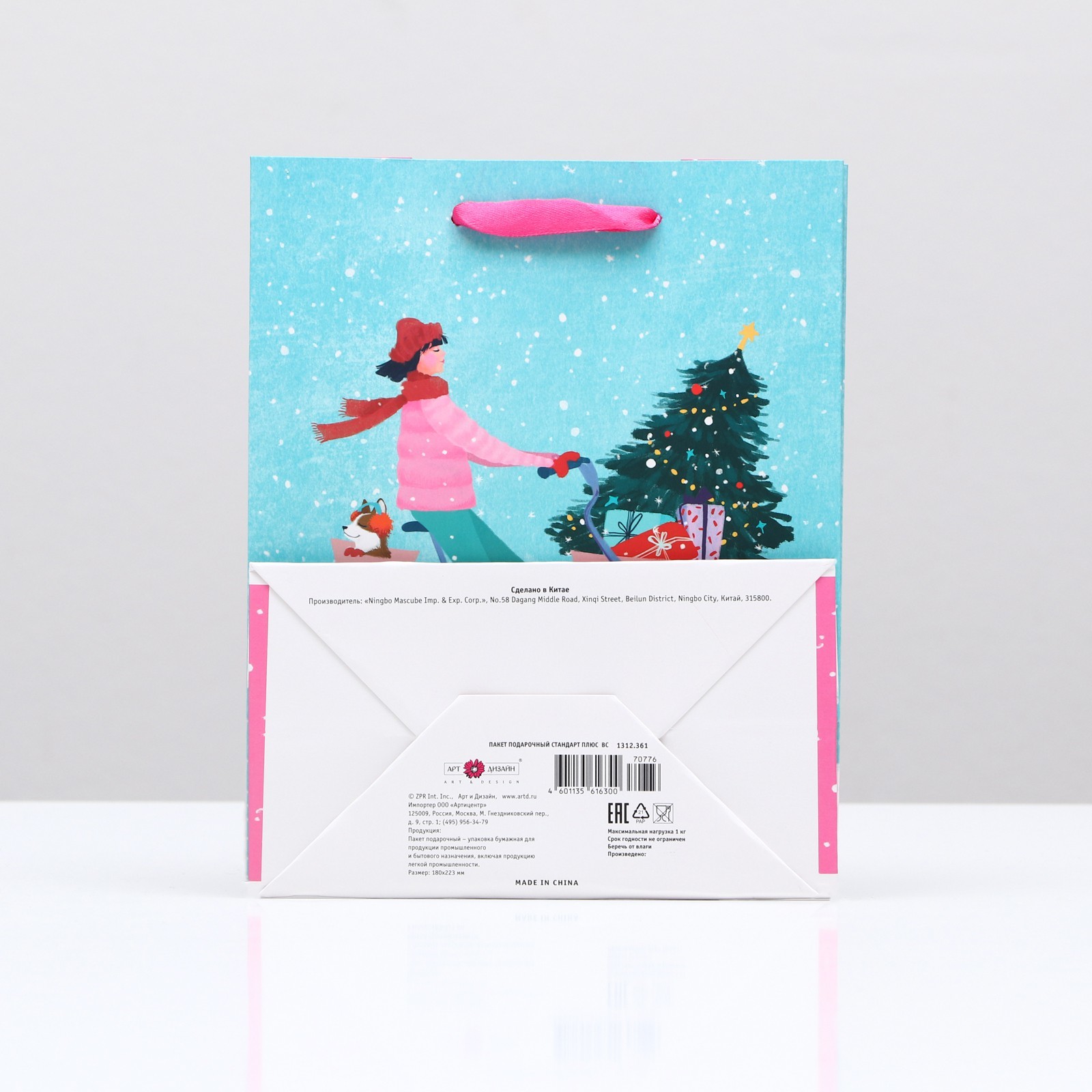 Пакет прямоугольной формы изготовлен из ламинированной бумаги.