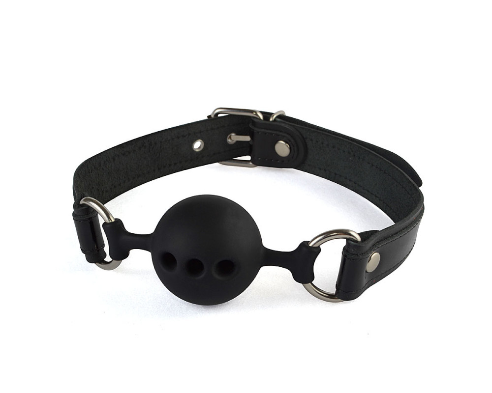 Силиконовый кляп-шар с ремешками из натуральной кожи черного цвета. Вдоль ремешков проходит лаковая кожаная накладка черного цвета. Регулируется девайс при помощи металлической пряжки. Металлическая фурнитура имеет никелевое покрытие.
