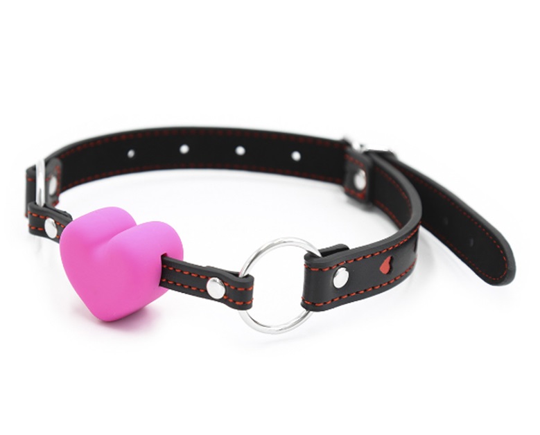 Кляп с черным ремешком и красной прострочкой. Шар выполнен в виде фиолетовый сердца. Материал медицинский силикон