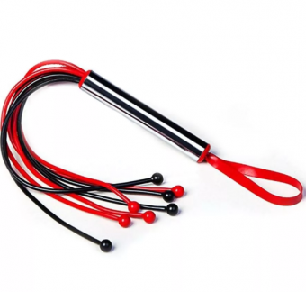 Плеть мини изготовлена из натурального гипоаллергенного латекса, имеет 8-9 хвостов длиной 20-25 см. Кончики хвостов усилены шариками для увеличения ударного эффекта. Ручка металлическая, хромированная, длина 10 см, диаметром 16 мм. Цвет черно-красный