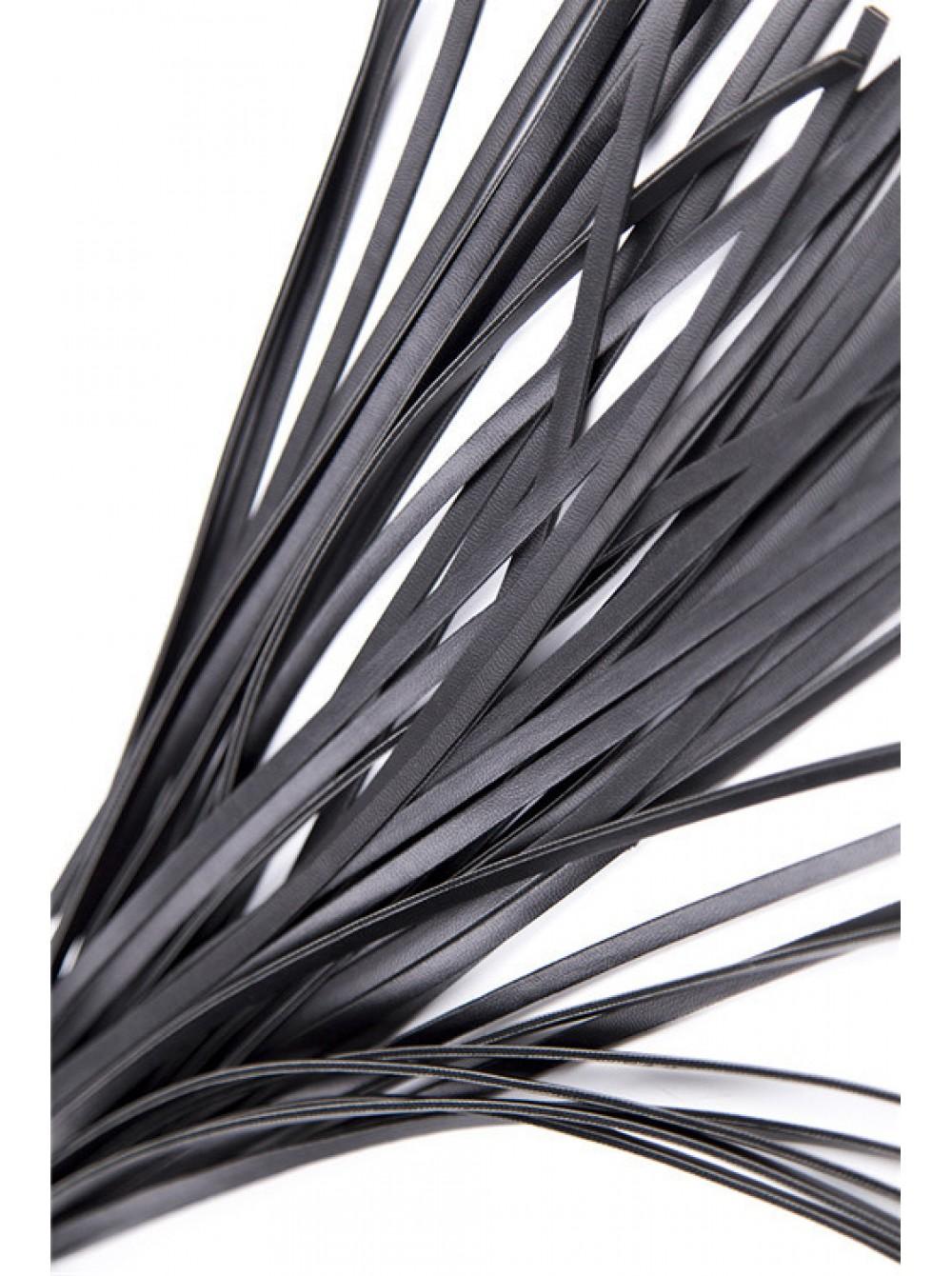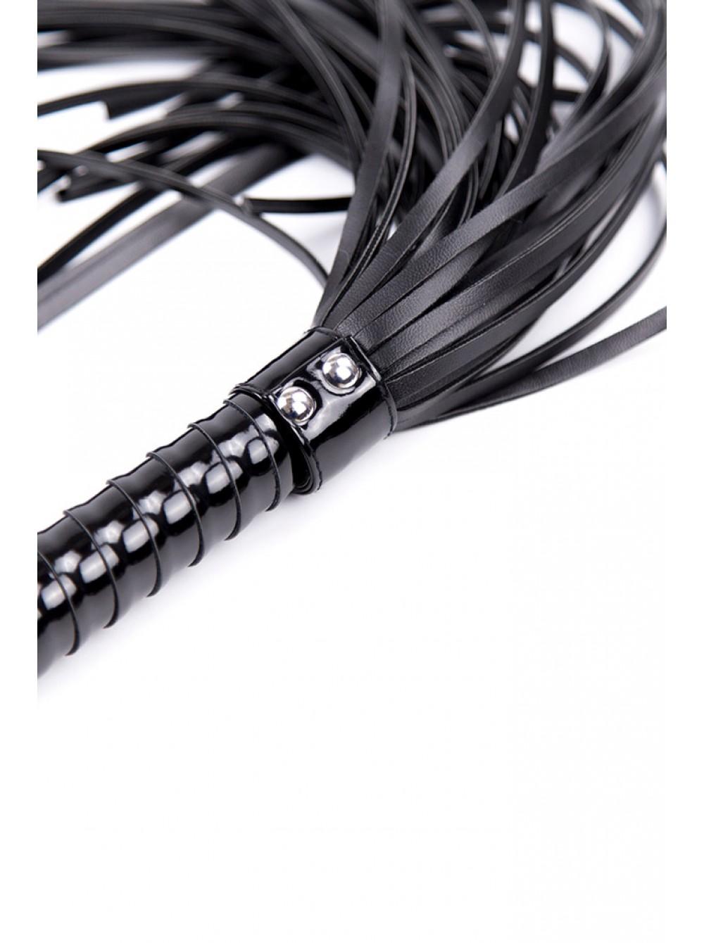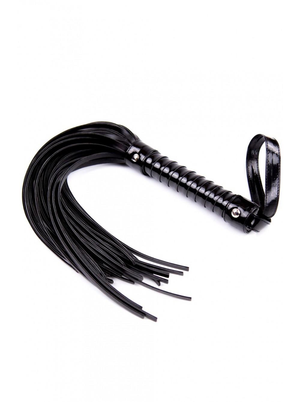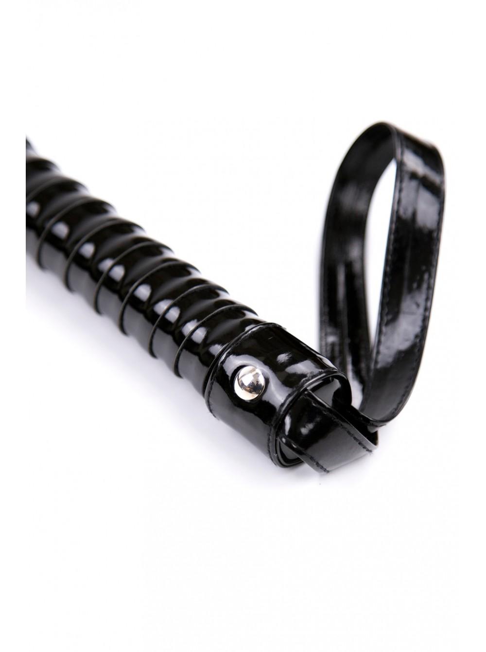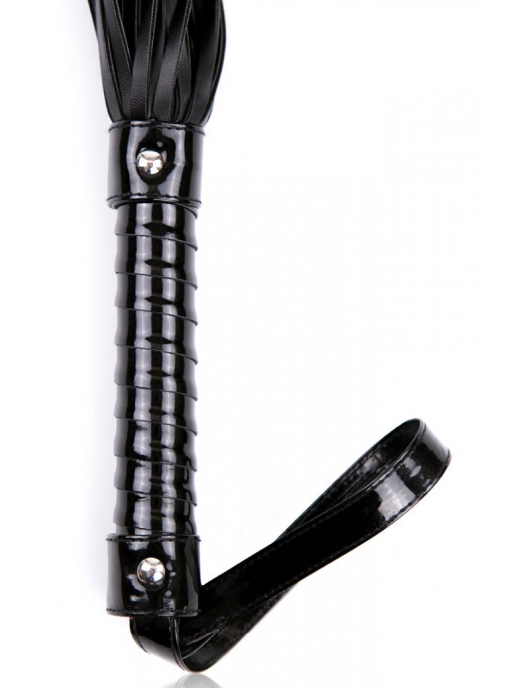 Черная лакированная плеть - БДСМ-аксессуар сделан в черном дизайне с лакированной рукоятью и ремешком; - Длина жесткой ручки - 15 см, длина хвостов - 29 см.
