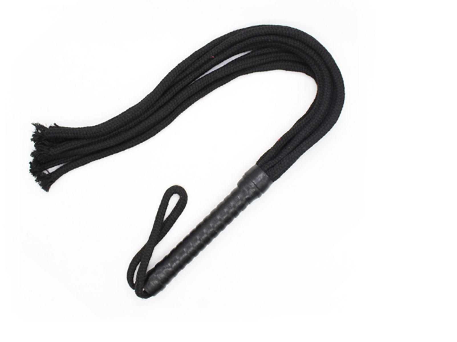 Веревочный флоггер с черными хвостами и ручкой из экокожи мягко разогревает кожу и готовит к более серьезным воздействиям.