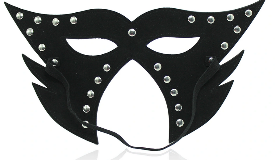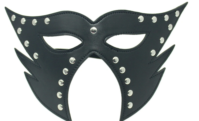 Черная маска с отрытими глазами из эко-кожи с металлическими вставками.