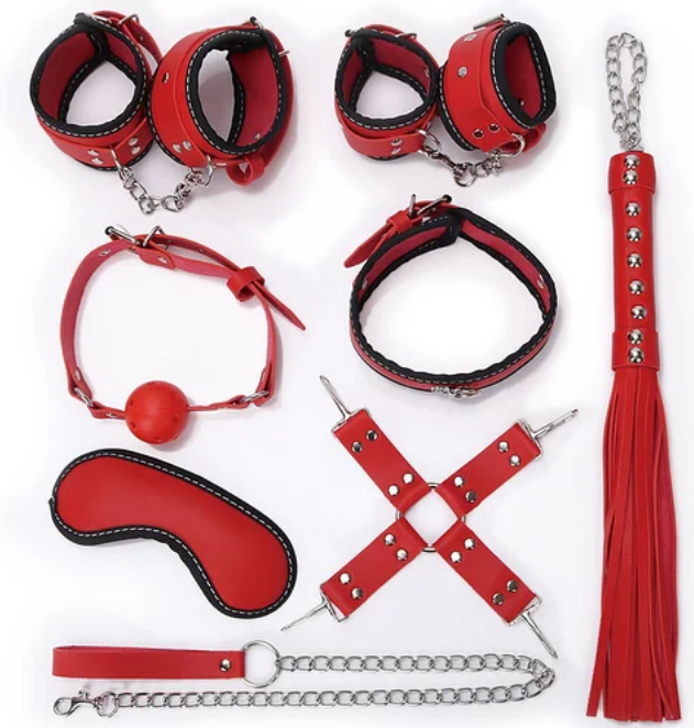 Кляп, наручники, оковы, ошейник и маска снабжены специальной внутренней накладкой, предотвращающей натирание кожи. Также изделия имеют возможность регулирования размера.