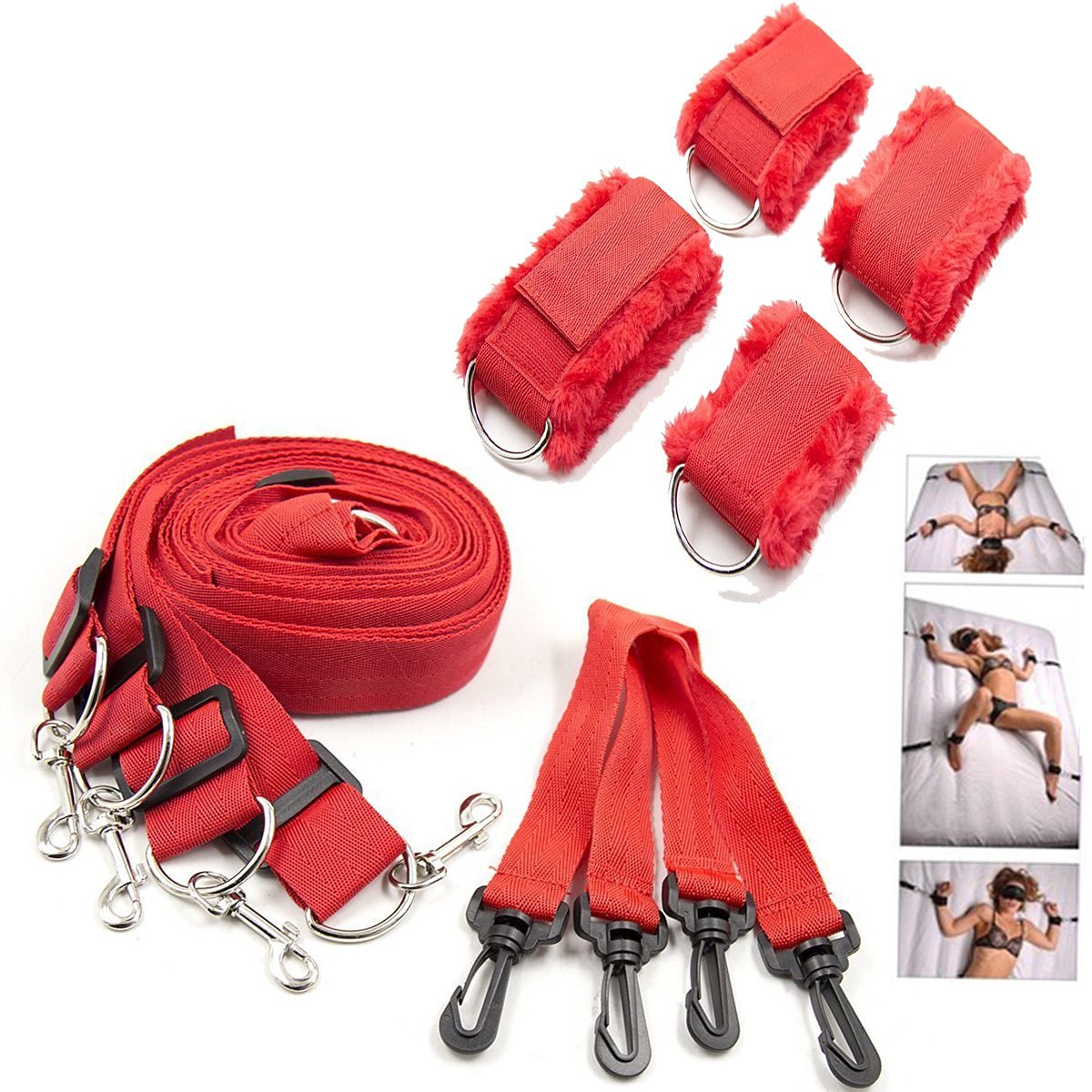 Руки и ноги фиксируются мягкими наручниками, которые регулируются по размеру лодыжек и запястий. От наручников проходят тканевые ремни, регулируемые по размеру кровати. Подчиняемый может двигаться в зависимости от силы натяжения ремней.