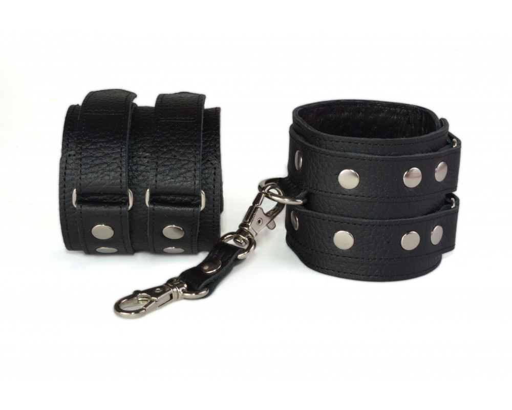 Изготавливаются из натуральной кожи с велюровой подкладой. При изготовлении использована фурнитура с никелевым покрытием. Между слоем основы и подкладой проложена мягкая прокладка. Соединяются между собой коротким ремешком с двумя карабинами на концах. Не нарушают кровообращение, надёжно фиксируются на запястьях с помощью двух ремешков на 'липучке'. Размер универсальный.