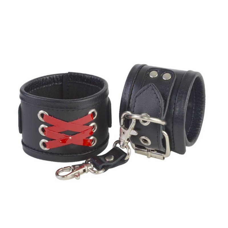 На наручниках находятся полукольца, для соединения их между собой при помощи двух карабинов, скреплённых кожаным ремешком. Регулировка размера и фиксация изделия производится при помощи металлической пряжки. Вся металлическая фурнитура имеет никелевое покрытие.