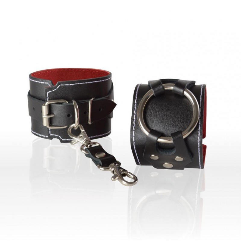 Готические фигурные накладки, удерживающие большое металлическое кольцо, придают наручникам агрессивной сексуальности и роскоши. Соединяются наручники при помощи небольших карабинов, скреплённых кожаной перемычкой. Для комфортного использования внутренняя часть наручников выполнена из бархатистой велюровой кожи.