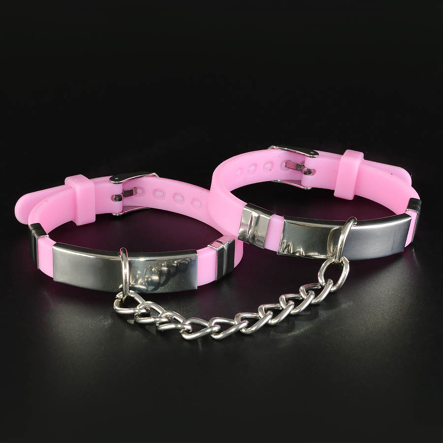 Наручники изготовлены из силикона розового цвета и соединены цепочкой. Длина наручника 22 см, ширина - 1 см. Масса 40 гр.