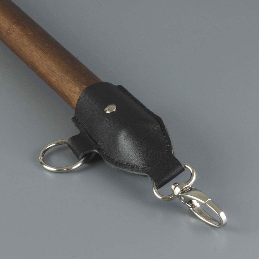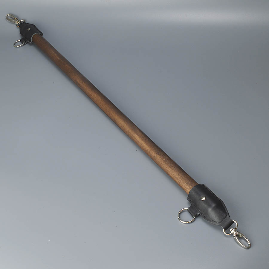 Распорка Эко серии имеет деревянную основу (d 21 мм, длина 60 см), кожаные накладки и 2 никелированных карабина для фиксации и кольца для присоединения наручников. Общая длина распорки с карабинами 70 см. Масса 200 гр.