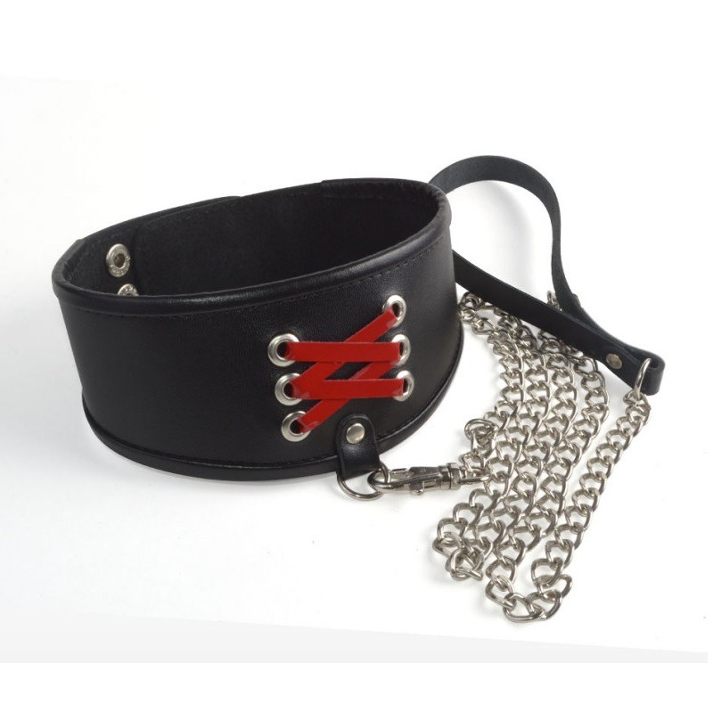 В паре с ошейником идёт поводок-цепочка, что позволит держать партнёра на необходимом расстоянии. С одной стороны цепочки располагается карабин для крепления к ошейнику, с другой, кожаный ремешок-петля, который для удобства можно разместить на запястье.