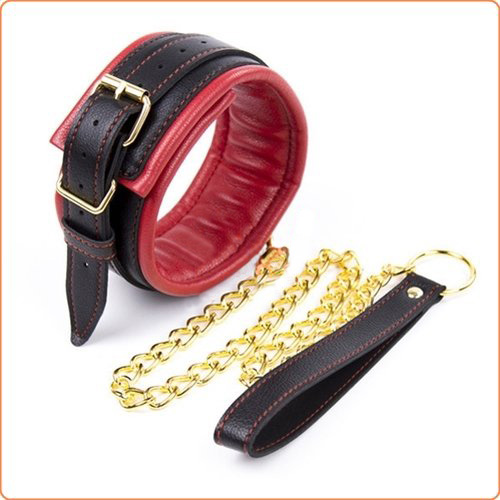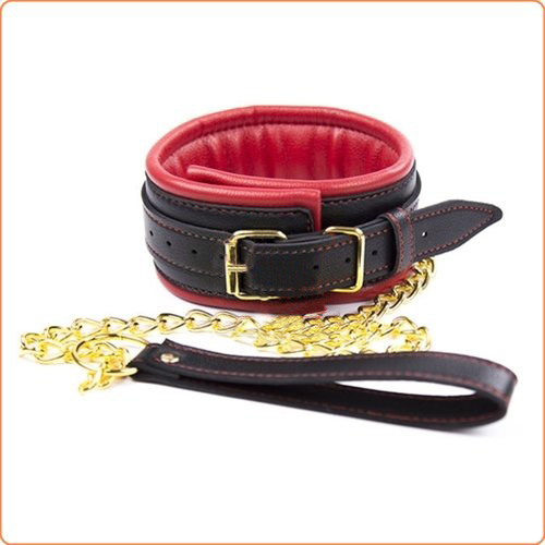 Ошейник с поводком черно-красного цвета с золотым поводком. Материал искуственная кожа