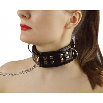 Ошейник предназначен для создания эротичного образа в ролевых играх, а также позволит управлять партнёром при помощи поводка. Ошейник изготовлен из лаковой искусственной кожи черного цвета. В качестве подклады используется искусственный мех, мягкий и приятный на ощупь. Регулируется ошейник при помощи металлической пряжки. Фурнитура имеет никелевое покрытие. В комплекте с ошейником идет поводок в виде цепочки с карабином и петлёй из искусственной кожи, для запястья. Длина поводка-цепочки составляет около 1 м.