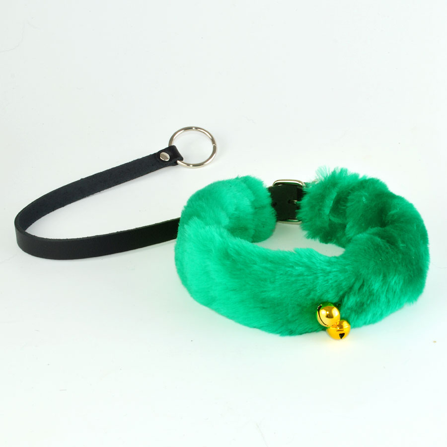 Ошейник изготовлен из натуральной кожи и дополнен съемным искусственным мехом насыщенного зеленого цвета, а также декорирован золотистыми, звонкими бубенчиками. Регулируется при помощи ремешка и металлической пряжки.