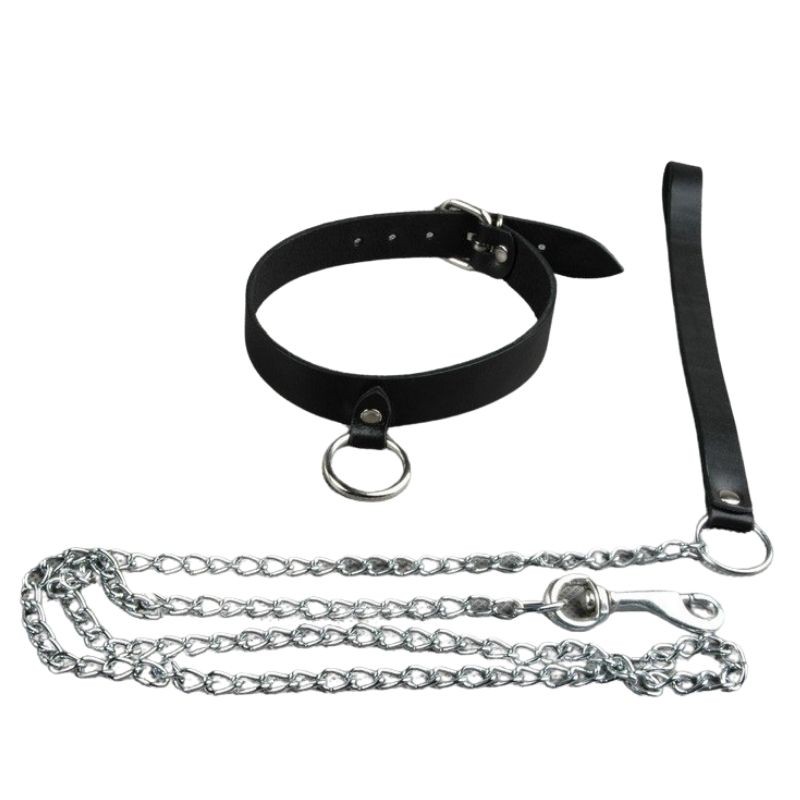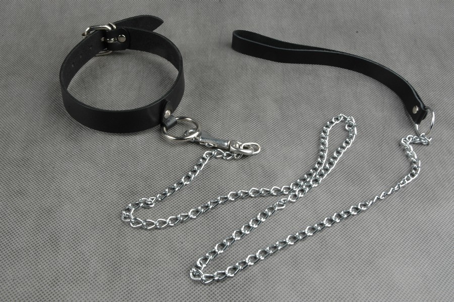 Ошейник изготовлен из натуральной кожи чёрного цвета. Цепной поводок с карабином имеет петлю в цвет для подвеса и надежной фиксации в руке.