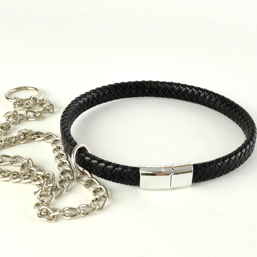Ошейник состоит из плетеного винилового шнура шириной 11 мм и магнитных застежек. Общая длина ошейника 43 см. К ошейнику прикреплен поводок длиной около 50 см.