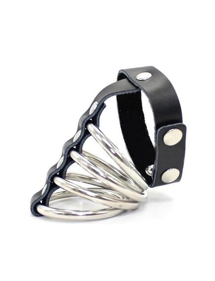 Сбруя на половой член состоит из 4 металлических колец и ремешка на мошонку, соединенных полоской черной искусственной кожи. 4 кольца одеваются на пенис, а ремешок застегивается с помощью кнопок на мошонке. Использование сбруи усиливает и продлевает эрекцию и делает оргазм более ярким. Подойдет не только любителям БДСМ-игр, но и любителям сексуальных экспериментов, которые хотят испытать новые ощущения и внести в интимную жизнь яркие краски. Размер: диаметр колец 4 см, длина ремешка на мошонку 22 см. Материал: металл, искусственная кожа. Цвет: черный.