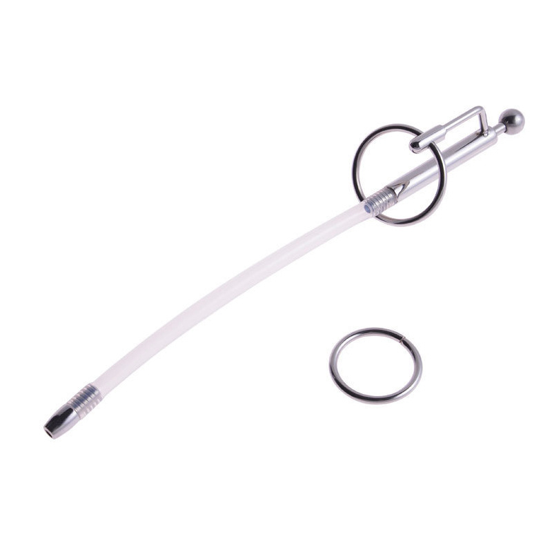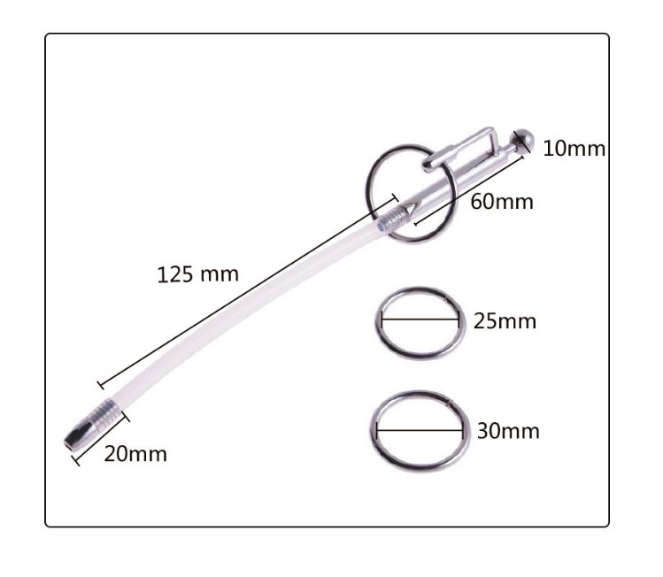 Ствол зонда — гладкий. На конце стимулятора имеется ограничитель с крючком который позволит легко извлекать и двигать зондом. В комплекте идут два силиконовых колечка на головку, на крючке специальное отверстие для колечка. Сперва оденьте кольцо на головку, потом, вставив зонд, закрепите катетер с колечком. Это не только даст возможность мастурбировать не боясь сдвинуть стимулятор, но и усилить внешнюю стимуляцию самой головки.