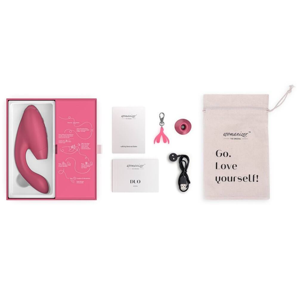 Полностью водонепроницаем. Womanizer Duo поставляется с элегантной атласной сумкой и в стильной коробке. В комплект входят зарядный USB-кабель, инструкция по применению и дополнительная силиконовая насадка малого объёма.