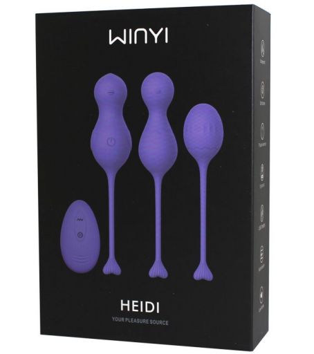 HEIDI - набор вагинальных шариков для тренировки мышц тазового дна (двойные виброшарики с пультом ДУ, двойные шарики без вибрации, одинарный шарик без вибрации). Предназначены для неинвазивного лечения слабого мышечного контроля, приводящего к частому мочеиспусканию, недержанию мочи и низкой сексуальной удовлетворенности. Изготовлены из силикона, безопасного и приятного на ощупь материала. Длина виброшариков - 16,9 см., диаметр - 3,7 см. Длина двойных шариков - 16,8 см., диаметр - 3,4 см. Длина одинарного шарика - 14,3 см., диаметр - 3,4 см.