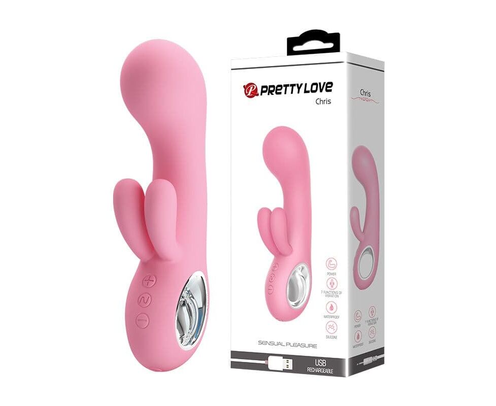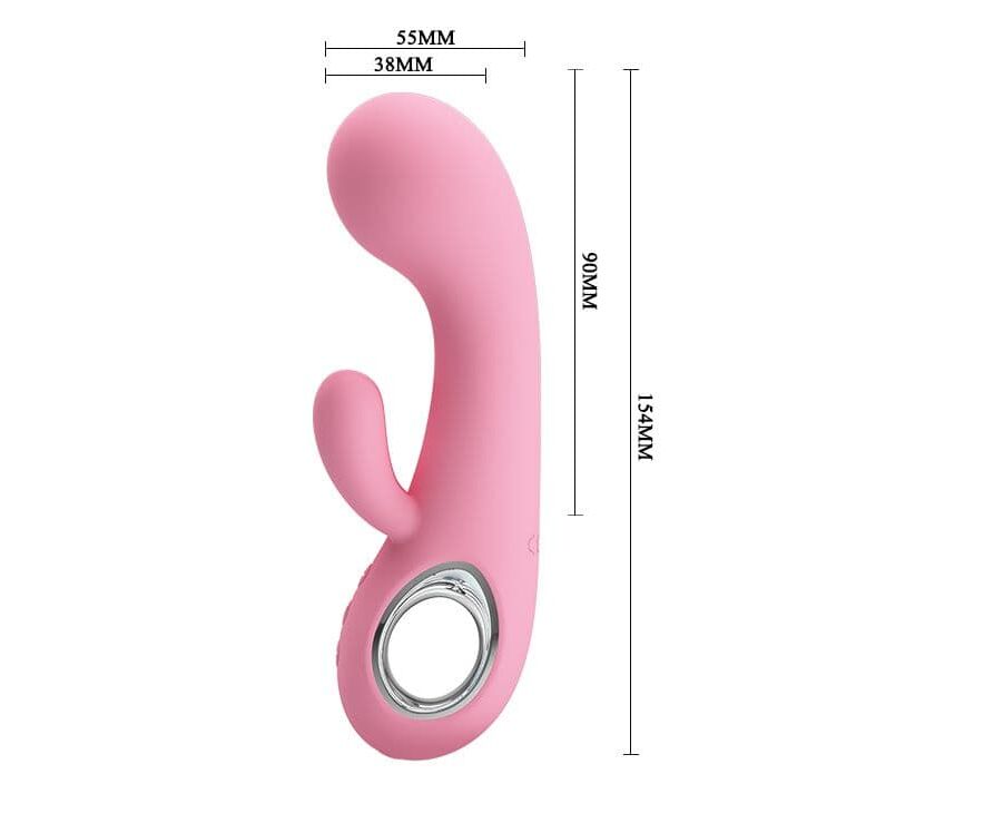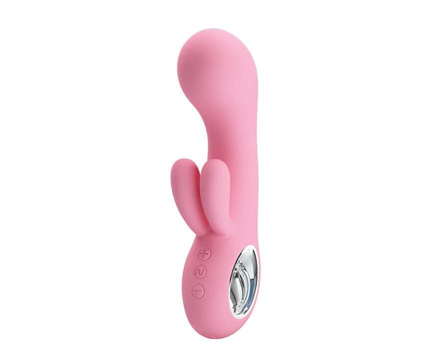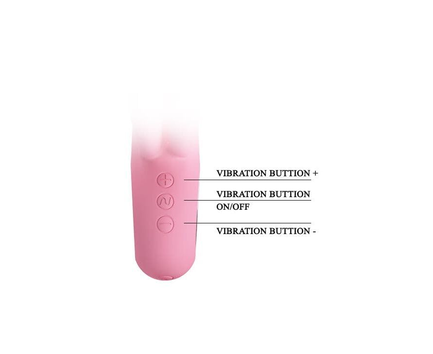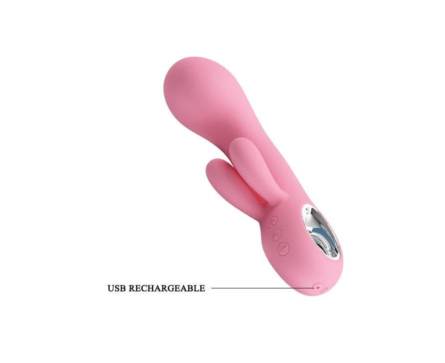 Многоскоростной перезаряжаемый вибратор бирюзового цвета компактного размера. Имеет клиторальный стимулятор в виде ушек зайчика. Гладкая поверхность. Имеет 7 режимов вибрации, управление производится при помощи кнопок у основания игрушки.