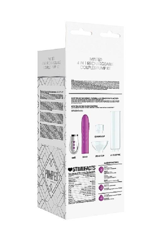 Набор Twister 4 in 1 Rechargeable Couples Pump Kit Shots, фуксияTwister - 4 in 1 Rechargeable Couples Pump Kit - набор, состоящий из 4 предметов. В него входят универсальное основание, к которому могут быть прикреплены помпа для сосков или клитора, помпа для груди или вульвы, помпа для пениса и насадка в виде дилдо с функцией 'ротация'. Мощный мотор, способный вращаются со скоростью 11000 об/мин, обеспечивает 4 уровня всасывания и 7 режимов вибрации. Комбинации, которые можно получить с помощью этого набора, бесконечны.ПрименениеПомпы способствуют стимуляции и увеличению чувствительности сосков, клитора, груди, вульвы. Помпа для пениса обеспечивает более твердую эрекцию, а также при регулярном использовании увеличение полового органа. Насадка в виде дилдо может быть использована как самостоятельно, так и в сочетании с вагинальной помпой, обеспечивающей одновременную стимуляцию влагалища и сосание клитора и вульвы. Насадка в виде дилдо позволяет обеспечить одновременную стимуляцию влагалища и всасывание кли