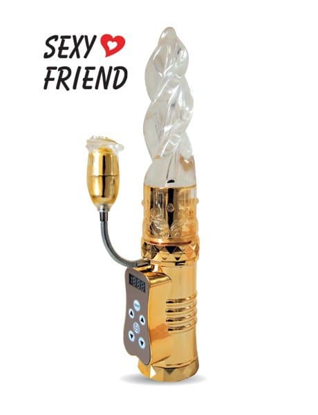 Многофункциональный вибратор золотого цвета Rose от компании Sexy Friend. Выполнен из термопластичной резины, которая имеет очень приятную поверхность на ощупь. У данного вибратора 2 виброэлемента, один в стволе, а другой в клиторальном отростке. Отросток закреплен на специальной ножке, которая легко может менять своё положение, подстраиваясь под ваши анатомические особенности. Блок управления двумя вибромоторами находится на ручке вибратора. Не забудьте приобрести смазку на водной основе!