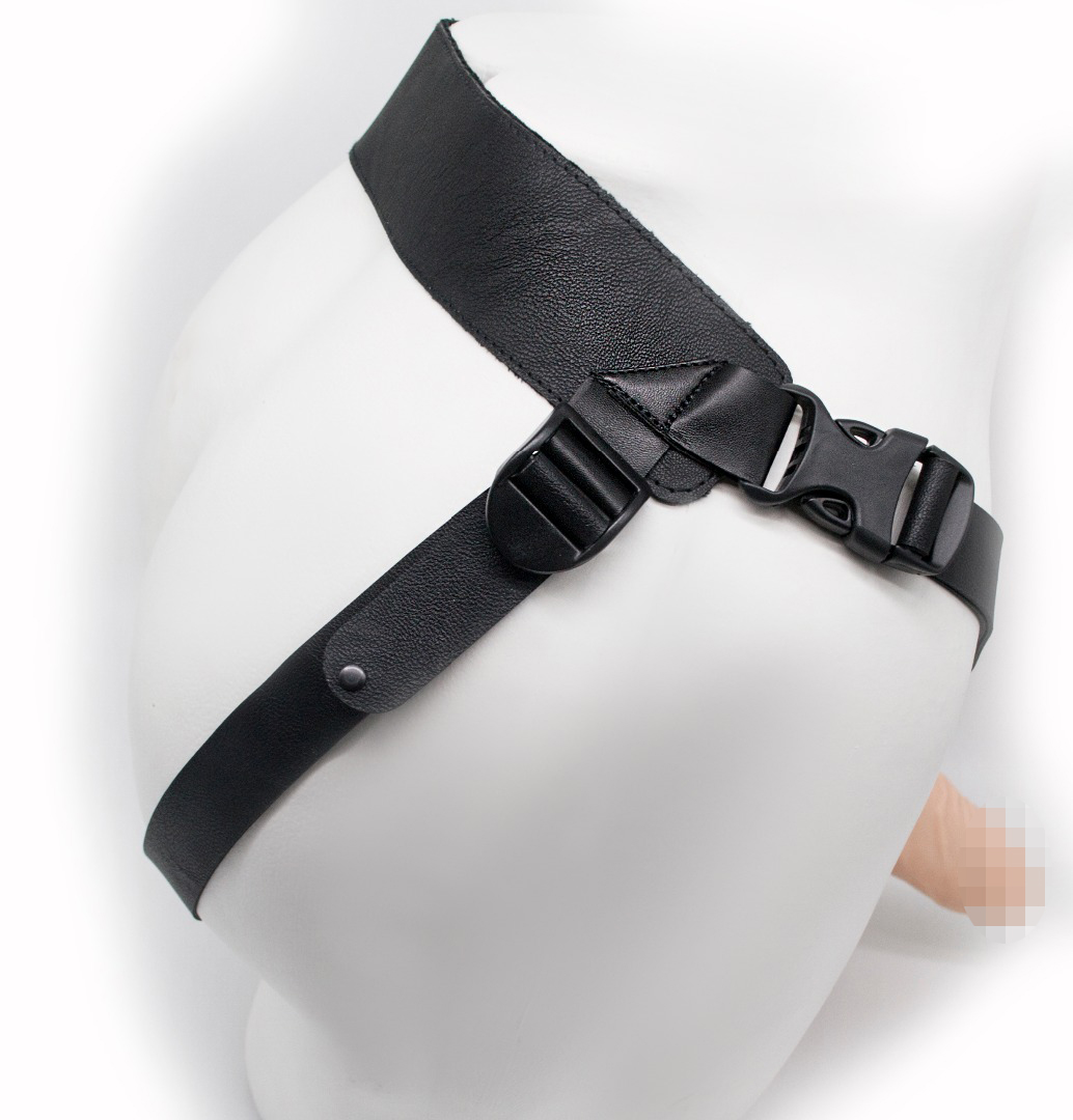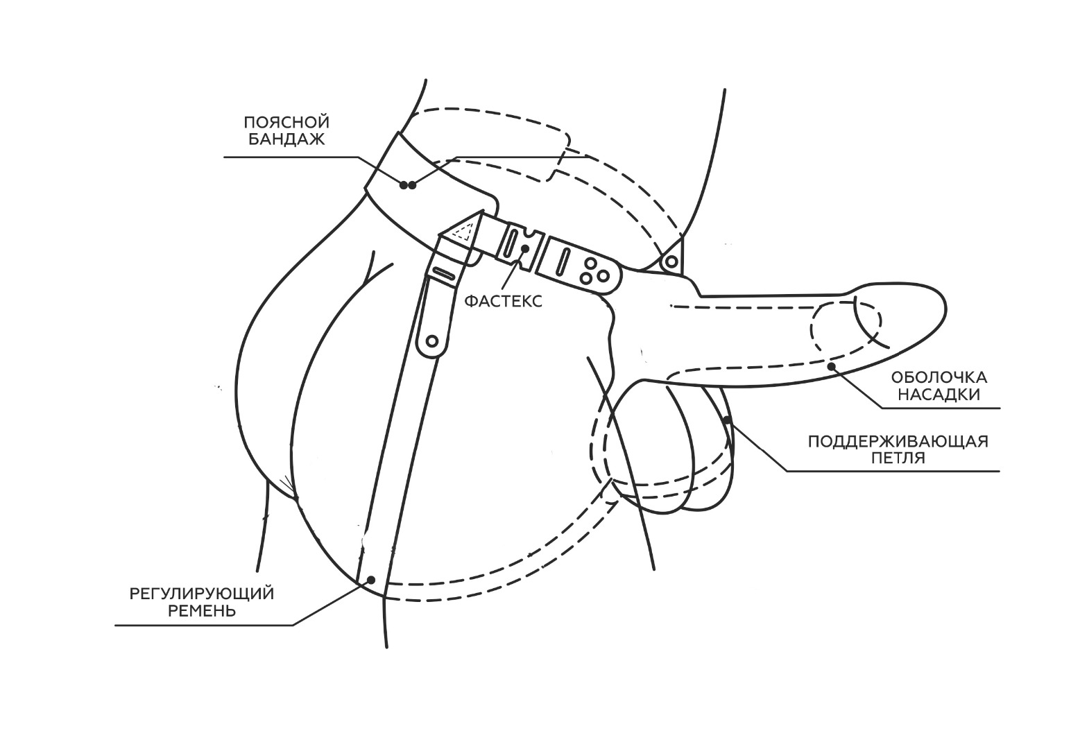Каркас (пустотелый фаллоимитатор) для мужчин имеет четыре кожаных ремешка для закрепления на теле. Снизу