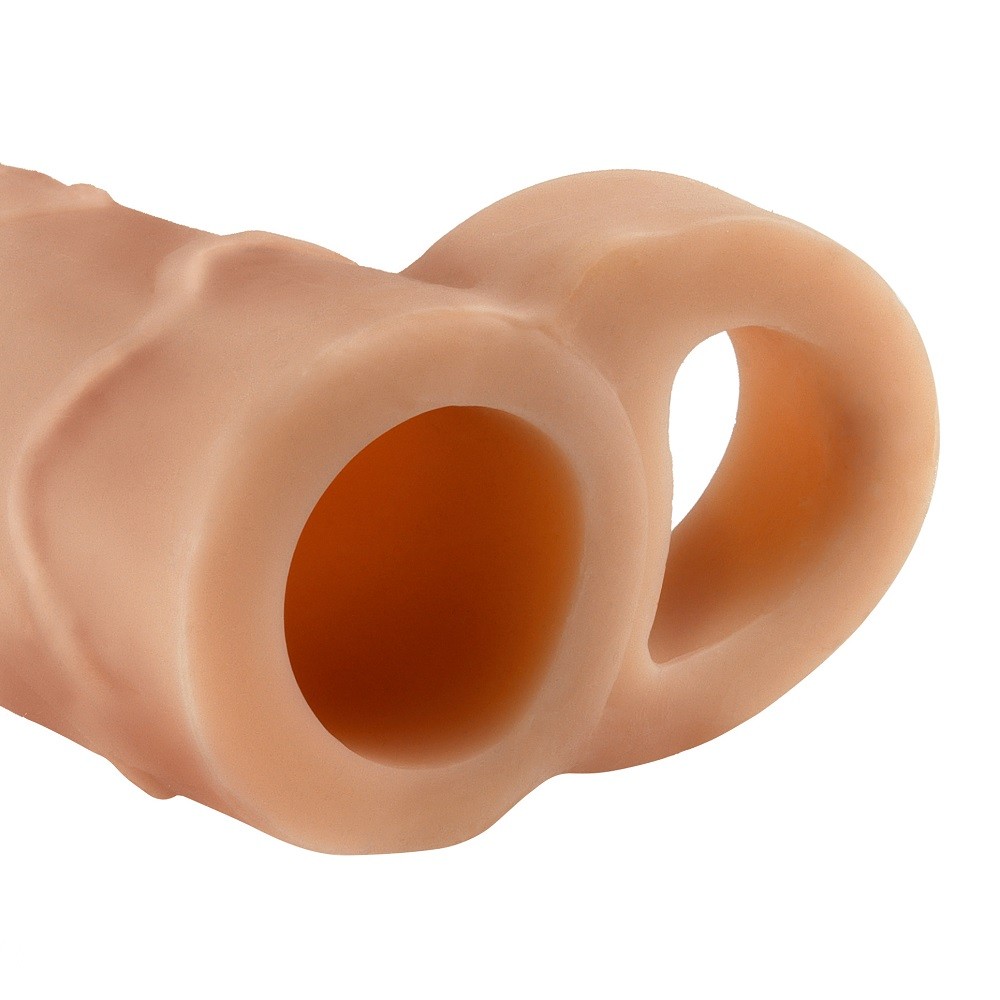 Подходит для большинства размеров. Увеличивает диаметр на 33% и увеличивает длину на 7 см. У основания насадки имеется кольцо, которым опоясывается мошонка для пролонгации полового акта. Также кольцо способствует удержанию насадки на месте.