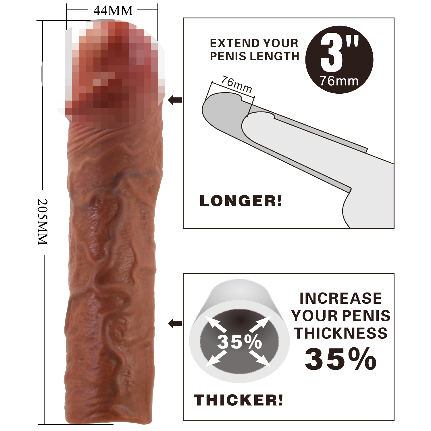 Изготовлена из высококачественного TPR-материала с реалистичной текстурой вен и увеличенной головкой, имитирующей анатомические особенности. Внутренний канал плотно облегает пенис, обеспечивая стабильную фиксацию и усиленную тактильную стимуляцию. Подходит для использования как во время полового акта, так и при индивидуальном применении.