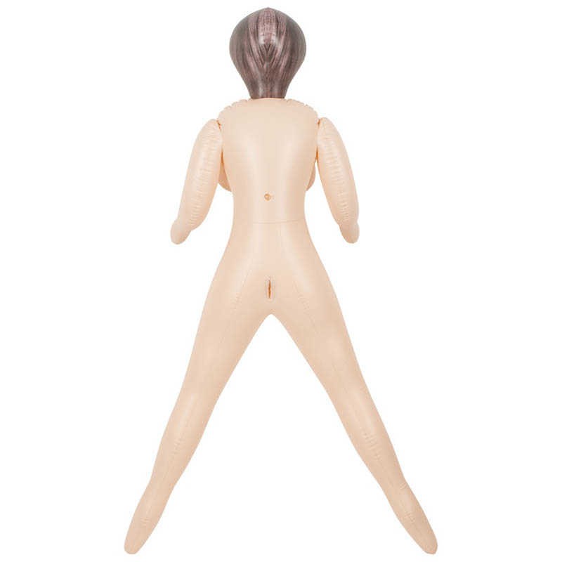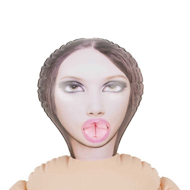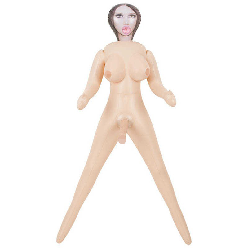 Большая грудь с твердыми сосками, 2 любовных отверстия (рот и анус) и реалистичный съемный фалоимитатор с рельефной поверхностью.