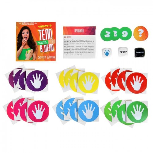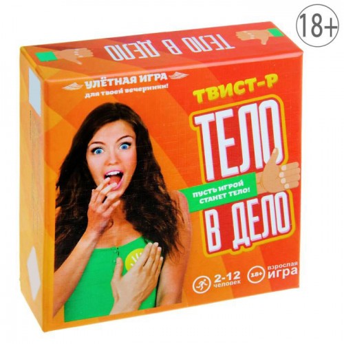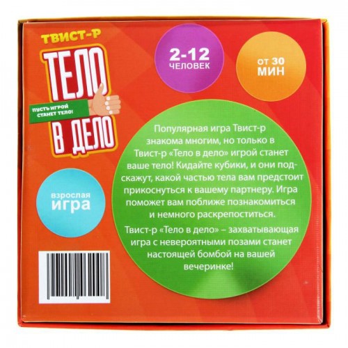 Культовая игра в 'Твист-р' по новым правилам!Эта популярная игра знакома многим, но именно этот твист-р очень отличается от классического. Ведь здесь игрой станет ваше тело! Да-да, именно на него будут клеиться наклейки, место которых определят кубики. Уже в предвкушении? И правильно! Ведь вас ждут невероятные позы и фантастические эмоции.Правую руку на грудь партнера!Кидайте кубики, один из которых определит место на теле партнера, до которого вам предстоит дотронуться, а второй подскажет, каким местом вы будете его трогать! Губы, шея, грудь, руки – всё смешалось в этой игре. Яркие наклейки разнообразят процесс, но если они закончатся – в правилах написан вариант игры без их использования.С кем играть?Можно играть парами, а можно и большой компанией! Ведь твист-р 'Тело в дело' станет настоящей бомбой на вашей вечеринке. Игра поможет вам поближе познакомиться друг с другом, немного расслабиться и отлично повеселиться. Собирайте компанию друзей и проводите время незабываемо!