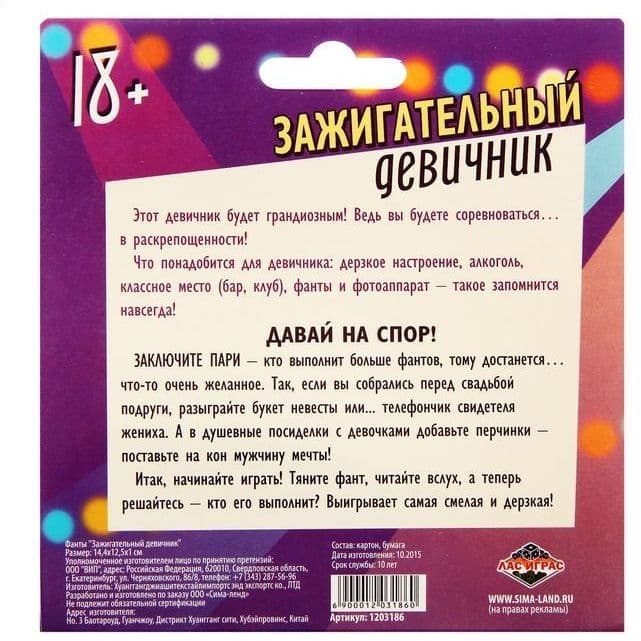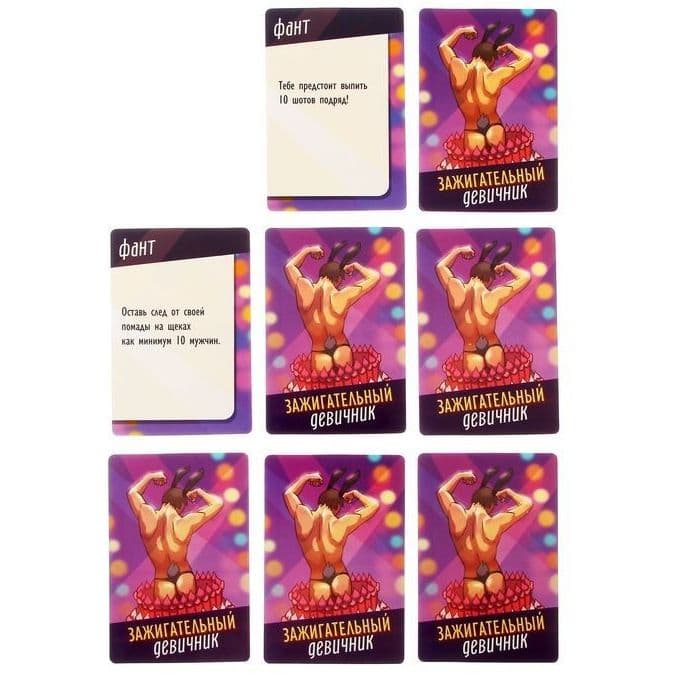 Собираетесь с подругами зажечь на свадьбе или вечеринке? Пусть все вокруг лопнут от зависти, ведь перед вами уникальный набор фантов, который сделает праздник незабываемым. Обязательно возьмите фотоаппарат — о вашем веселье будут ходить легенды! Вам предстоит… продемонстрировать все секреты обольщения незнакомцев, исполнять грязные танцы и выполнять другие провокационные задания.Для начала поставьте что-нибудь на кон — добавьте азарта! Например, выигравшая девушка получает букет невесты. Играть очень просто: вытягивайте фанты, зачитывайте задания и определяйтесь, кто возьмётся его выполнять. Справились с задачей? Забирайте карточку. Победит самая смелая и дерзкая: только у неё получится собрать больше всего карт!