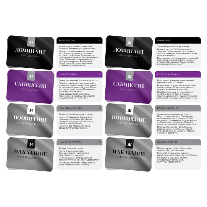 Выберите, кто будет исполнять роль Сабмиссива, а кто - Доминанта, и воплощайте свои самые сокровенные фантазии с помощью карт выбранных ролей!