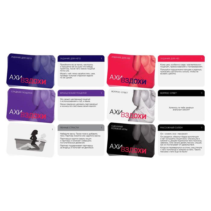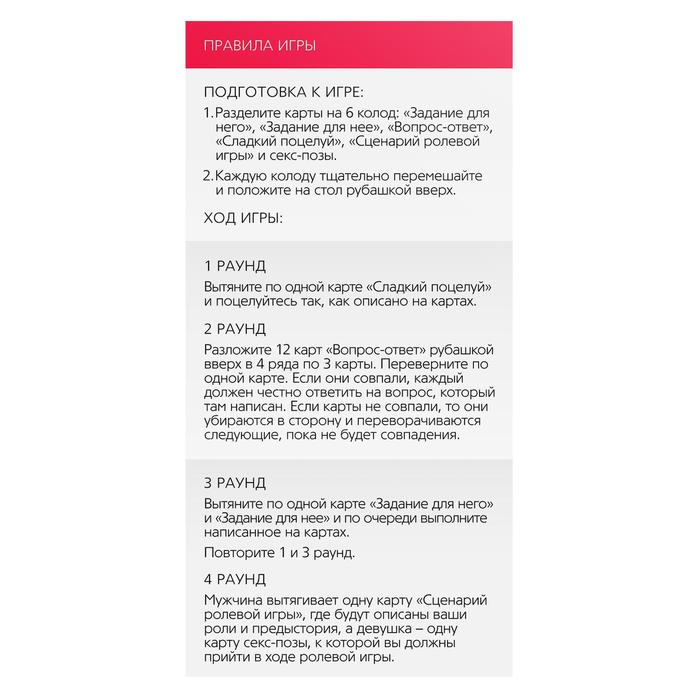 Эта игра поможет вам освежить свои отношения и погрузиться, как в первый раз, в пучину необузданных страстей. Внутри вы найдёте карты с волнующими вопросами и откровенными заданиями, сценарии для ролевых игр и карты с горячими секс-позами.