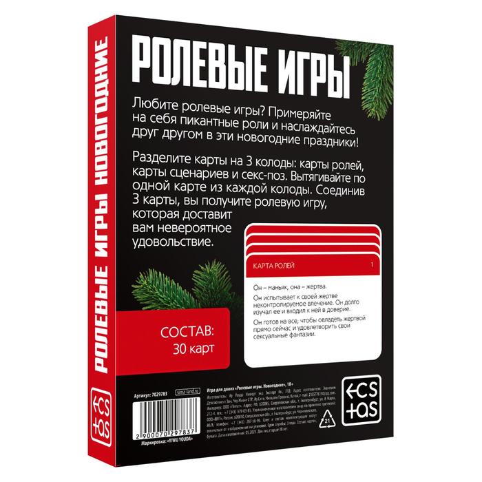 Разделите карты на 3 колоды: роли, сценарии и секс-позы. Вытяните по одной карте из каждой. Соединив вместе три карты, вы получите ролевую игру, которая доставит вам невероятное удовольствие!