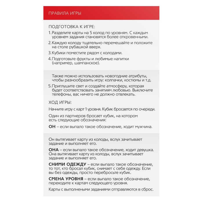 Разделите карты на 5 колод по уровням. С каждым уровнем задания становятся всё более возбуждающими. Бросайте кубик по очереди. Один из партнёров должен начать игру и бросить кубик, на котором есть следующие обозначения: