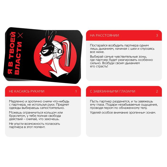 Вытягивайте карты из колоды в любом порядке и выполняйте написанное, не забывая об ограничениях в каждом задании. Поддавайтесь власти игры, и новые впечатления захлестнут вас.