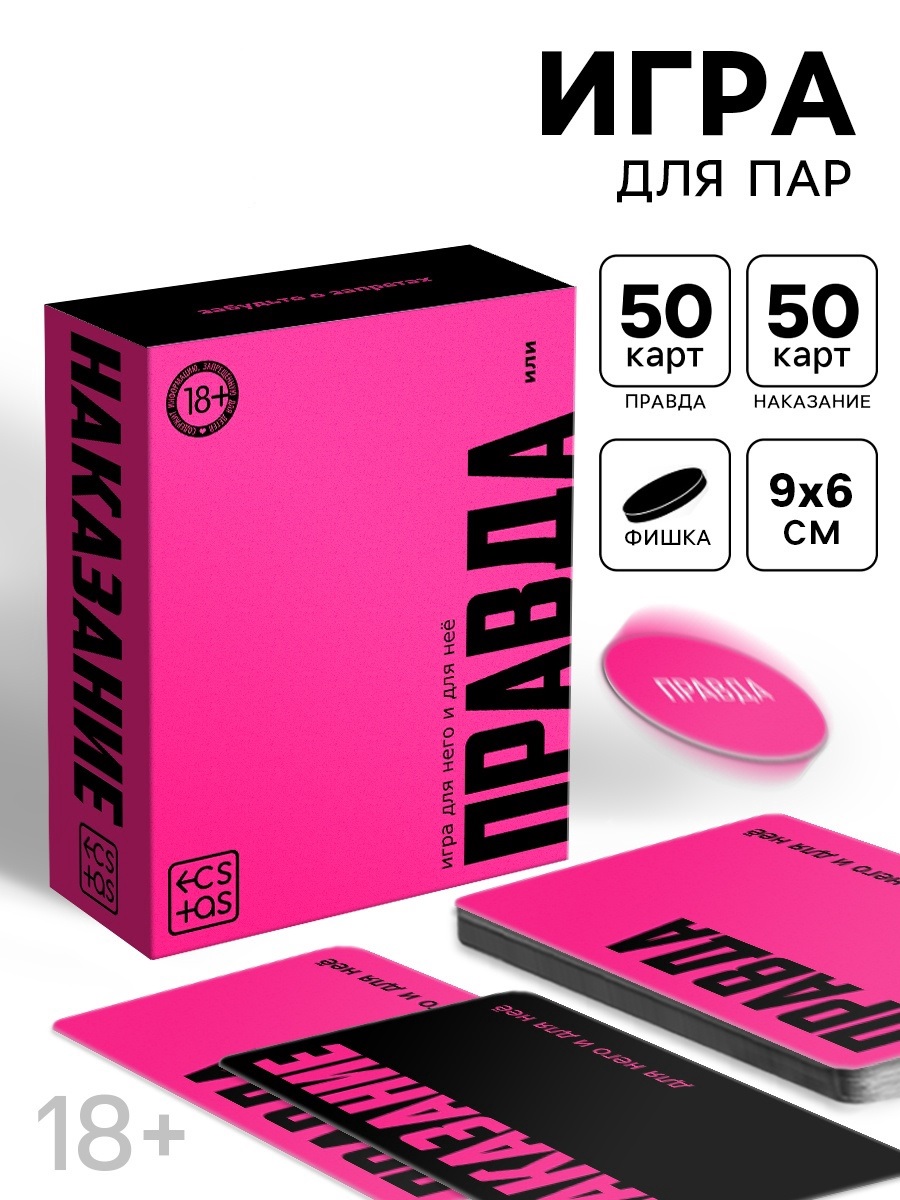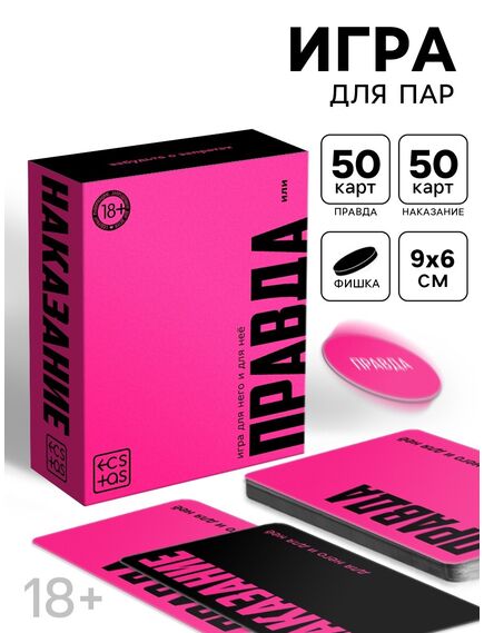 Эта игра поможет вывести ваши отношения на новый уровень! Просто подбросьте фишку. Если выпала «Правда» — тяните карту из соответствующей колоды и отвечайте только правду, какой бы она ни была. Если же выпало «Наказание» — значит, пришло время повысить градус сексуального напряжения между вами!
