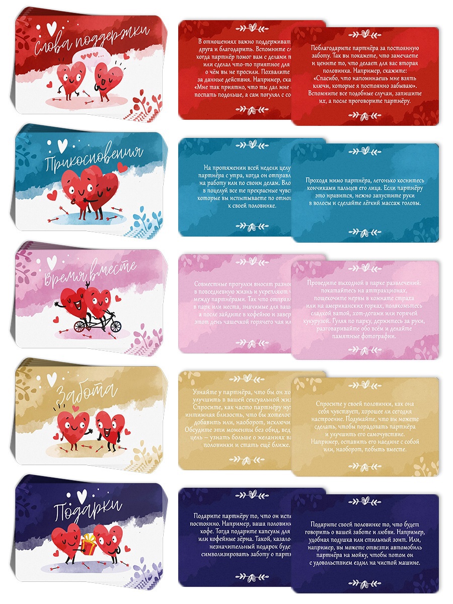 50 карт («Слова поддержки», «Время вместе», «Подарки», «Забота», «Прикосновения»)