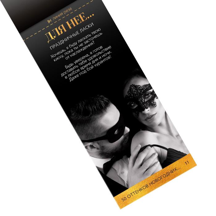 Внутри вы найдёте 10 купонов «Для неё» и 10 купонов «Для него». Это пикантные новогодние желания, которые вы можете исполнить, чтобы порадовать свою половинку. Отрезайте купоны по линии реза, выбирайте подходящий и вручайте его любимому человеку. Этот праздник оставит только приятные впечатления!