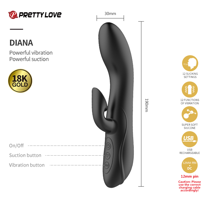1. Вибромассажер "Diana" оснащенный мощным мотором с тихой, но очень мощной вибрацией. Его особенностью является то, что он имеет стимулятор клитора, который имитирует посасывающие движения, как при оральном контакте. 12 режимов вибрации и 12 режимов всасывания переключаются с помощь кнопок у основания игрушки.