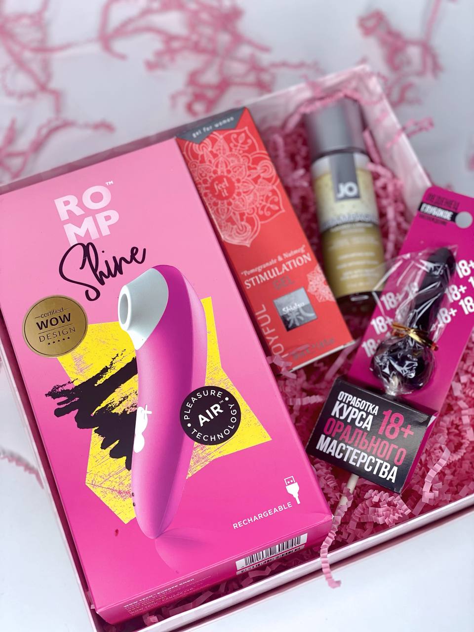 5) Бесконтактный клиторальный стимулятор Romp Shine (Romp Shine сочетает в себе передовые разработки, немецкое качество и лаконичный дизайн. Благодаря уникальной бесконтактной технологии Pleasure Air, вы сможете получить самый яркий оргазм в вашей жизни, почти не касаясь себя. Мягкая силиконовая насадка воздействует на головку клитора с помощью вакуумно-волновой стимуляции, ускоряя процесс возбуждения во много раз. А особая технология изготовления позволит наслаждаться играми не только в спальне, но и ванной, так как корпус стимулятора полностью водонепроницаем. Имеет 10 режимов стимуляции. Работает от магнитной зарядки до 45 минут. Корпус сделан из безопасного ABS-пластика, а головка из медицинского силикона. Тип питания: встроенный аккумулятор (USB кабель в комплекте) Длина: 15 см).