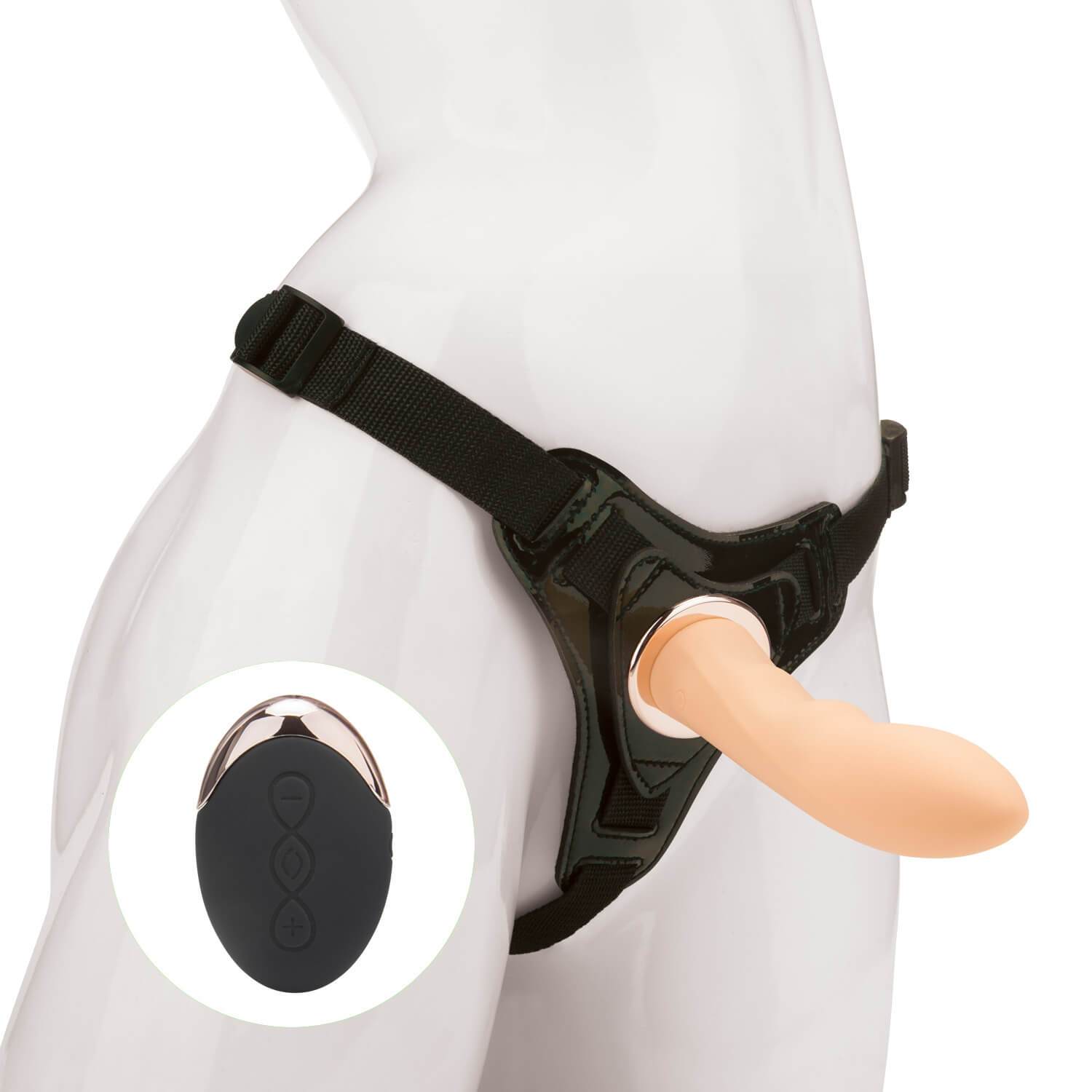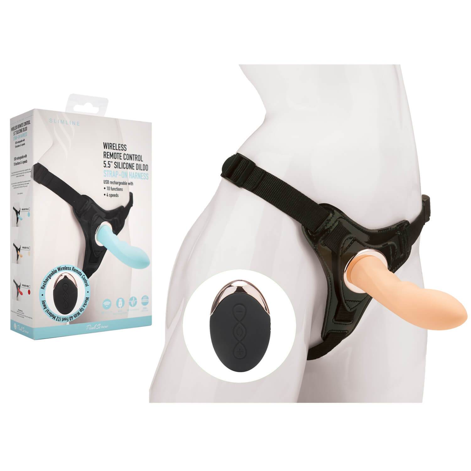 Вибрострапон с высококачественной насадкой. Фаллос телесного цвета из силикона имеет изогнутую форму, идеально подходящую для стимуляции точки G. Вибромодуль поддерживает 10 программ вибрации и 4 скорости стимуляции. Насадка крепится с помощью коннектора с резьбой и позволяет фиксировать насадку в страпон-системе, поэтому Вы сможете с легкостью поменять насадку на любую другую с такой же системой крепления. Для питания используется встроенный аккумулятор, заряжаемый по USB-кабелю. В комплект входит сбруя для крепления игрушки – она утягивает бедра и талию и регулируется при помощи специальных пряжек. Размер трусиков универсальный. Уникальностью данного страпона, является управления как с помощью пульта дистанционного управления, так и при помощи кнопки на самой насадке.