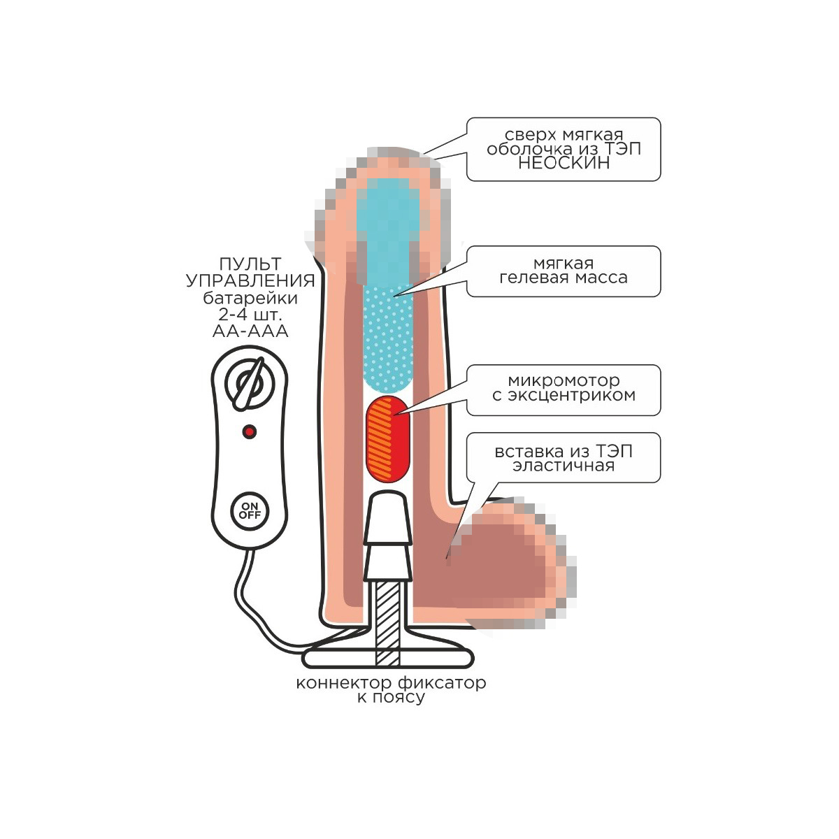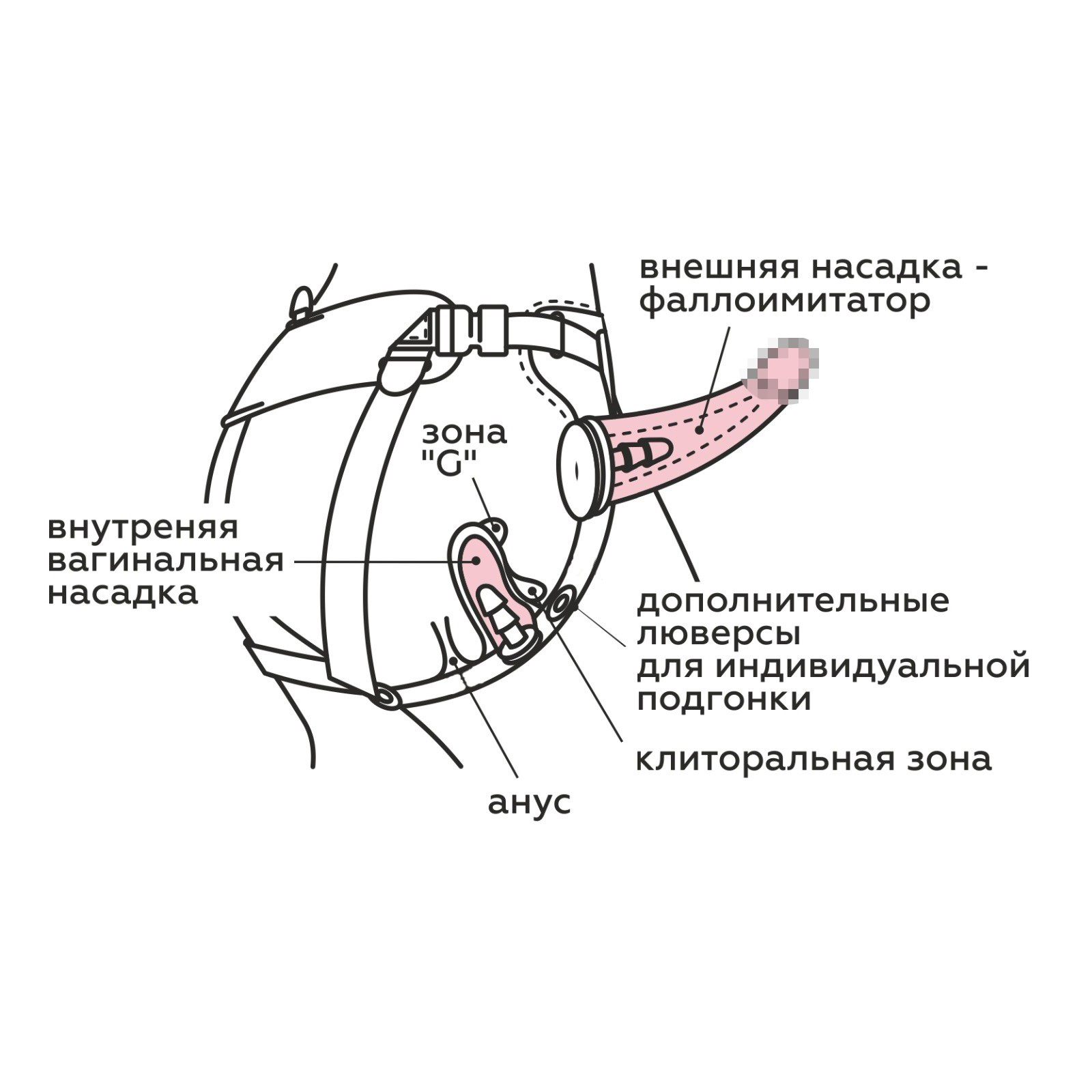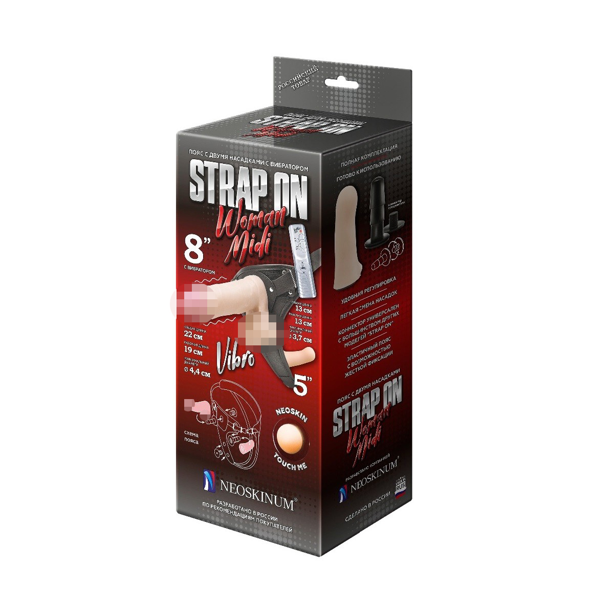 Пояс снабжен 2 насадками. Одна из насадок крупнее и исполнена из полумягкого материала (неоскин). Маленькая, полумягкая насадка предназначена для автостимуляции при сексуальном контакте.