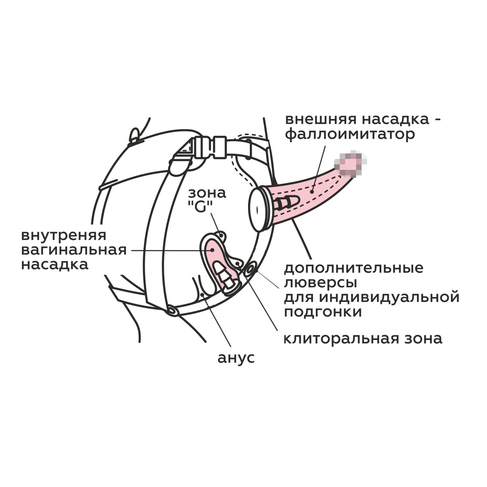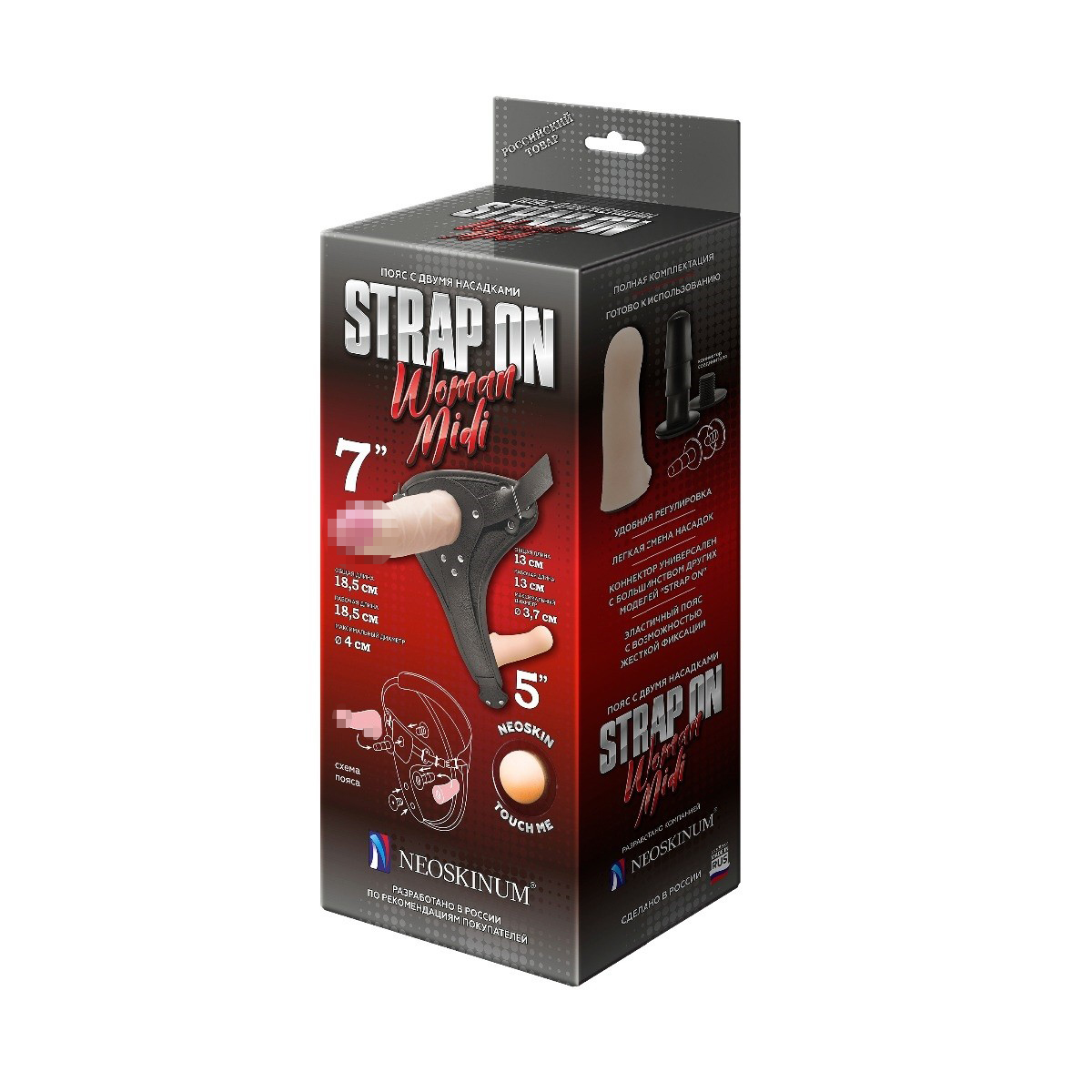 Пояс снабжен 2 насадками. Одна из насадок крупнее и исполнена из полумягкого материала (неоскин). Маленькая, полумягкая насадка – внутренняя и предназначена для автостимуляции при сексуальном контакте. 2 коннектора и универсальность стыковочного узла позволяют использовать абсолютное большинство насадок, входящих в ассортимент магазина Incognito и продающихся отдельно.