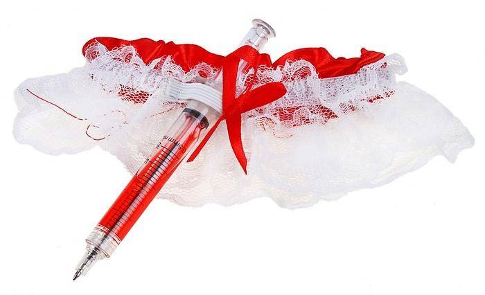Подвязка медсестры со шприцем – редкий аксессуар в мире эротических игр, однако его ценность неоспорима. Каждая сестра милосердия просто обязана помочь пациенту, чего бы ей этого не стоило. Поэтому иметь наготове шприц с красным содержимым – очевидное преимущество бравой медсестры, которая умело достанет его из кокетливой подвязки и применит по назначению.