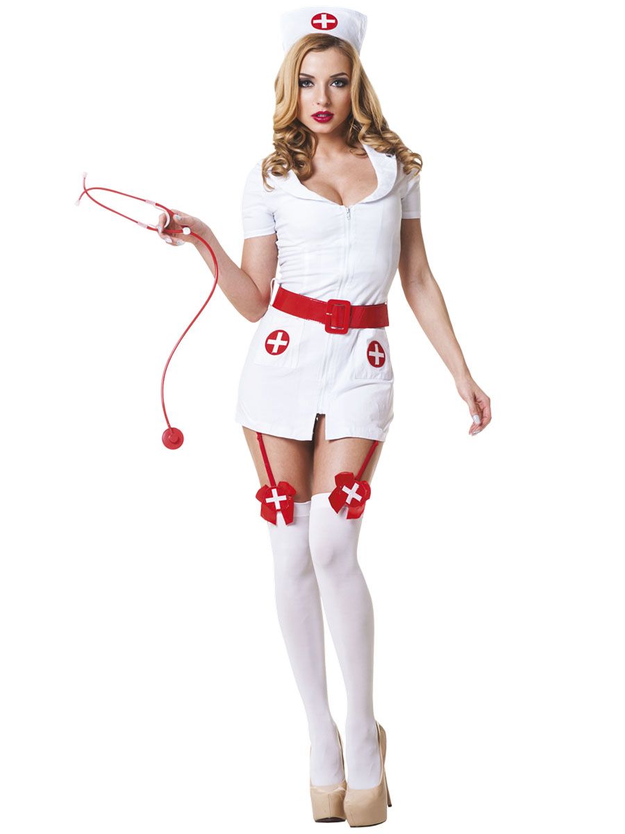 Костюм состоит из халатика с подвязками для чулок, головного убора, лакового пояса. Ультракороткий белый халатик с подвязками для чулок, лаковый алый пояс – раскованный и слегка похотливый образ создает данный костюм медсестры. Змейка в районе декольте позволяет регулировать открытость этой зоны.