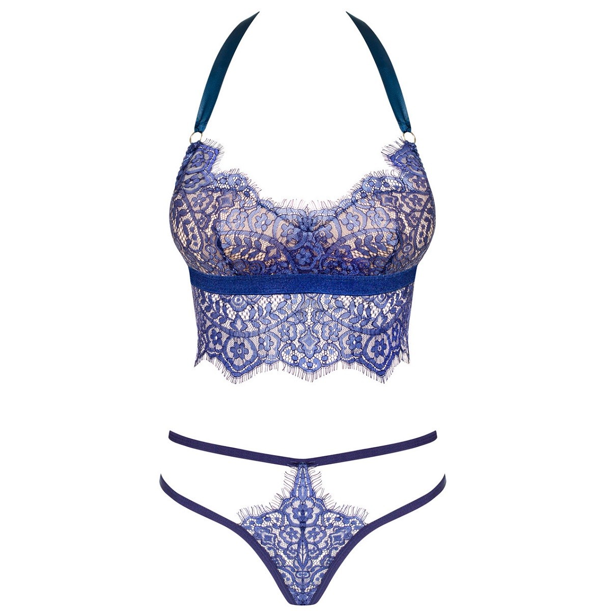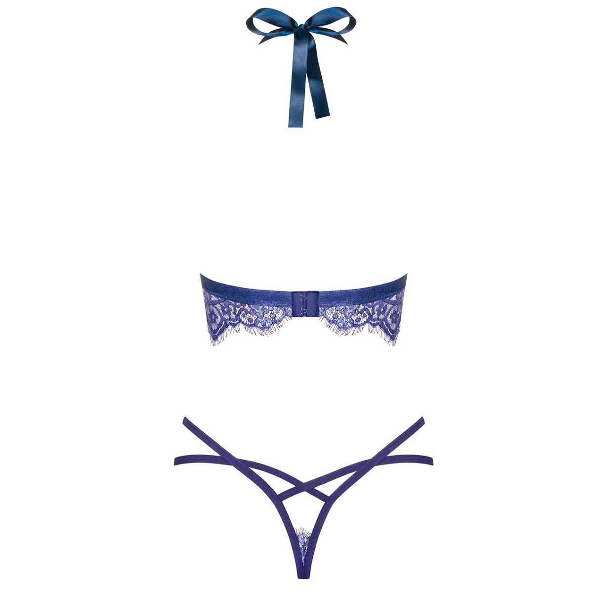 Бюстгальтер с мягкими чашками, без косточек, c уплотненной подкладкой, фиксируется атласными завязками через шею и застежкой на спине. Изящные трусики стринги из кружевного полотна и эластичных союзок.